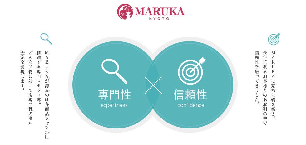 MARUKA(マルカ)について MARUKAとは 特徴・強み MARUKAイズム VISION 特徴・強み MARUKAとは MARUKA(マルカ)は古都京都で創業した質屋「質屋マルカ」を母体として、2001年に有限会社疋田が設立した買取・販売店です。現在では、京都市内を中心に7店舗を展開しており、ブランド品をはじめ、ご不要になった宝石・貴金属・時計・骨董・お酒等の幅広い品目の買取サービスを行っています。MARUKAをご利用くださるお客様には、専門スタッフの確かな審美眼による安心と信頼のあるお取引をさせていただいています。